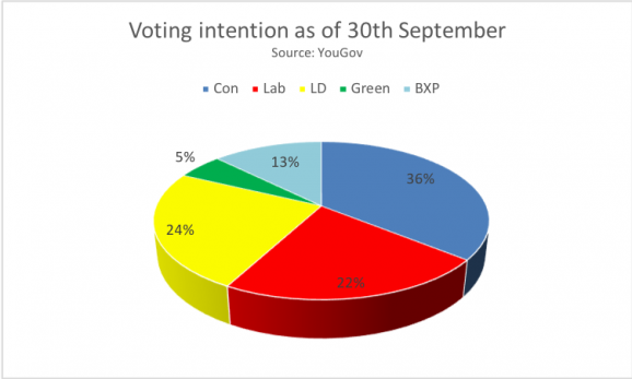 The Conservatives are leading with 36% followed by LibDems at 24%, Labour 22%, Brexit Party 13%  and Green party 5% as of 30th September. However, anything can happen by 12th December
