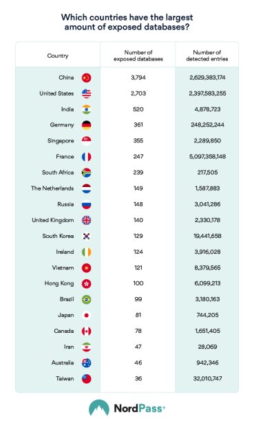The United States comes second, with nearly 3,000 unsecured databases and almost 2.3 billion entries made available online.