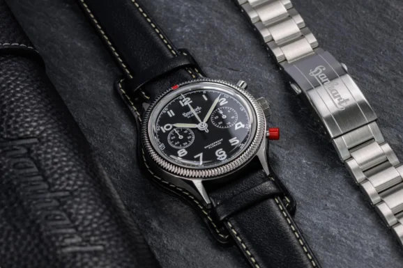 The company’s roots reach back to 1882, when Johann Adolf Hanhart opened his watch shop in Diessenhofen, Switzerland. Twenty years later, the family relocated to Schwenningen am Neckar, then the largest watchmaking town in the world. Under Wilhelm Julius Hanhart, the brand expanded into wrist and pocket watches, and by the late 1930s was producing the single-pusher Calibre 40 and the two-pusher Calibre 41, watches robust enough to serve in demanding environments, including the cockpits of German military aircraft.