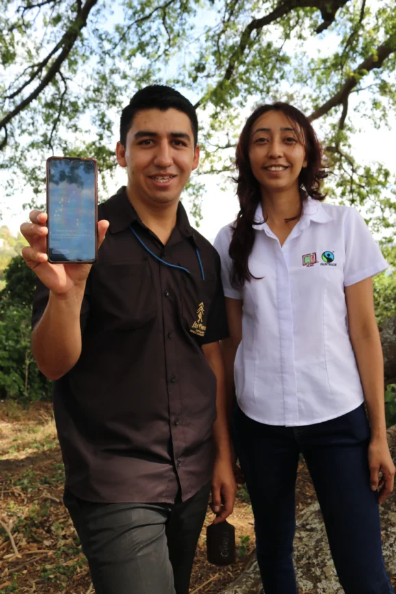 Felix Menjivar, an EUDR-geolocation technician, and Claudia Jimenes, The Latin American and Caribbean Network of Fair Trade Small Producers and Workers Country Manager for El Salvador. Photo: Fairtrade