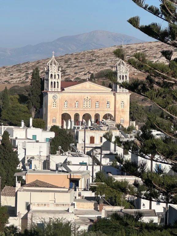 Later we turned inland for the climb to Lefkes, the old capital of Paros. The Royal Enfield coped easily with the winding ascent, weaving past terraces of vines and olive trees before the first whitewashed houses came into view. Lefkes is largely untouched by tourism. Its streets are cobbled, its balconies draped in bougainvillaea, and its neoclassical facades still stand intact. The village is closed to traffic, so we left the bike just outside and walked in. At Klarinos, a traditional café shaded by vines, we stopped for strong Greek coffee and plates of loukoumades, the bite-sized honey-soaked doughnuts that are as much a ritual here as a dessert. In the centre of the village the Agia Triada church dominated the skyline, its twin bell towers catching the afternoon sun and casting long shadows across the square.