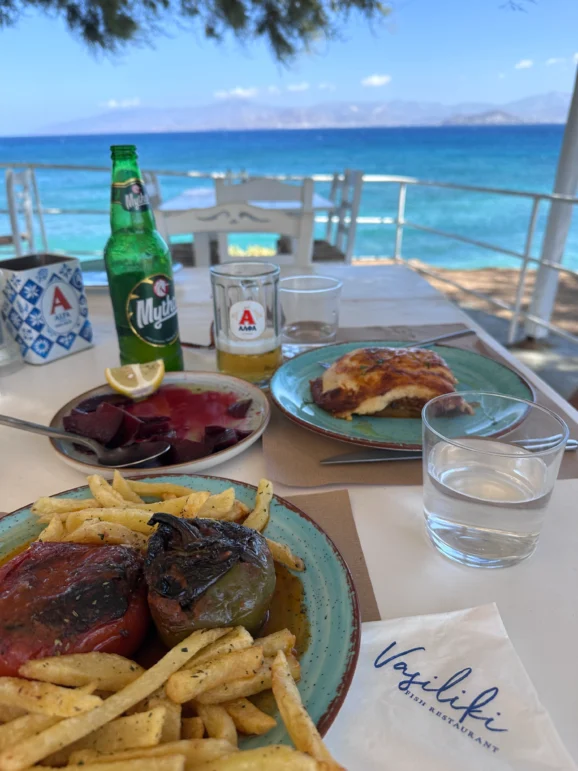 Lunch was at Vasiliki Fish Restaurant, where tables spill onto a terrace with a sweeping view across the water to Naxos. It’s absolutely stunning.