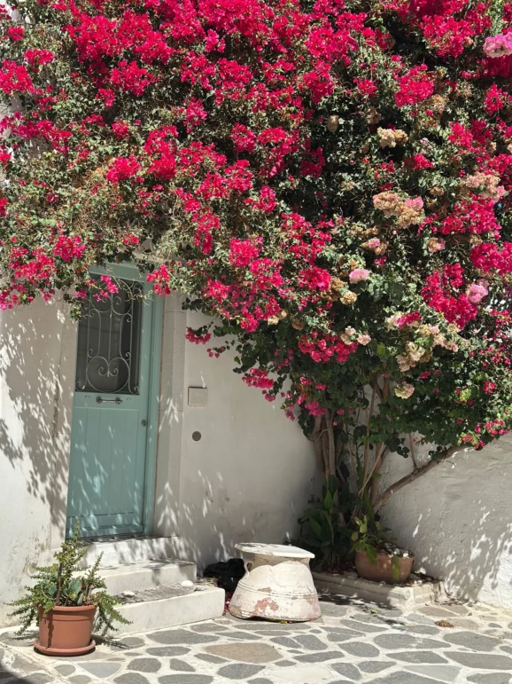 Our base was Kandiani Bleu Ciel in Naousa. This boutique hotel combines Cycladic style with comfort. Rooms are bright and simple, some with private terraces and hot tubs. Breakfast in the courtyard features spanakopita, fruit and yogurt with honey. Naousa itself has a lively old port filled with tavernas, cocktail bars and late-night music.