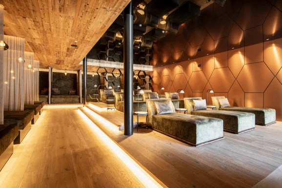 The accommodation follows the same principle of scale and choice. Standard doubles work well for couples, while family suites and multi-room apartments give space for children to spread out. At the top end, some rooms come with whirlpools set on the balcony, private Finnish saunas, or terraces that wrap around two sides of the building. The style throughout is stripped back rather than showy, with pale wood, glass and clean lines creating an Alpine minimalism that feels warm and calming after a day outside.
