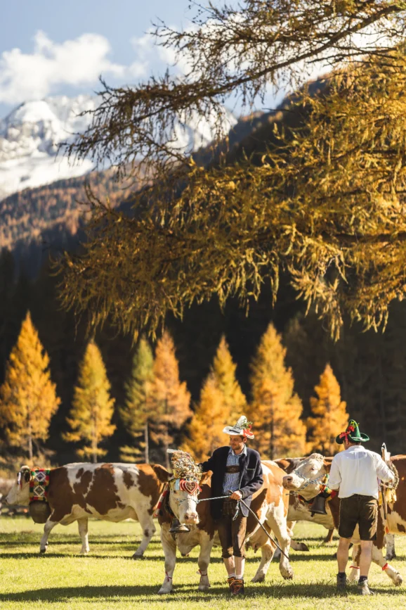 In September and October, the Almabtrieb sees cattle decorated with flowers and bells descend from the high meadows in a slow, festive procession, while evenings bring Törggelen, the South Tyrolean ritual of roasted chestnuts, smoky speck and new wine served in rustic taverns.