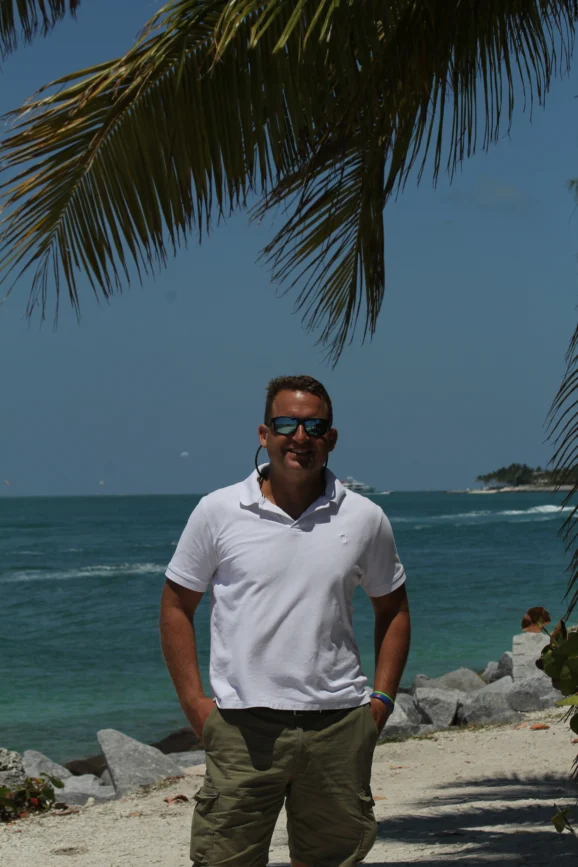 Insert image of Ben standing under palm trees by the sea) with the cap: Soaking up the Key West sunshine: where the Gulf meets the Atlantic, and time itself seems to slow to island pace. Credit: Supplied