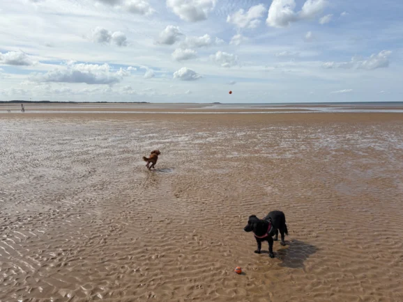 At low tide, the beach is vast due to its shallow, gentle slope. When we estimated it, the sea was a good 500m from the shore; it can go as far as 1km. This exposes miles and miles of beautiful sand to walk on, and the beach is blissfully dog-friendly.