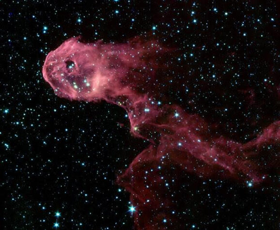 Infrared image taken by NASA’s Spitzer Space Telescope, revealing the glowing stellar nursery embedded within the Elephant’s Trunk Nebula (IC 1396 A). Credit: Supplied