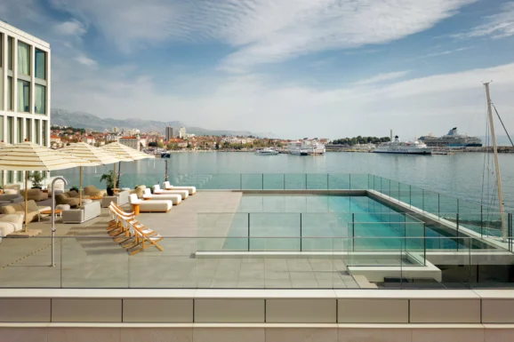 Today, Hotel Ambasador is a five-star luxury hotel with 100 contemporary rooms and suites filled with natural light. Clean lines, neutral tones, and natural materials allow the views to take centre stage, from the marina to Marjan Park and the UNESCO-listed old town.