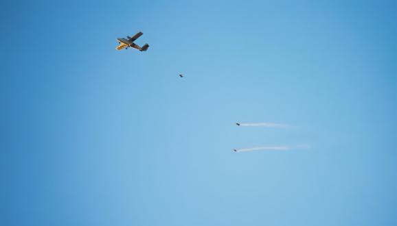 As they approached the tower, the team split formation. One flyer passed directly over the top of the structure, two tracked along its right and left sides, and the lead athlete flew through the hotel’s central architectural opening, known as the “Eye of the Needle”, before rejoining the group mid-air.