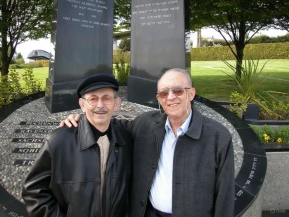 Leopold (left) and Kalman (right) reunited decades after their liberation, pictured together at a Holocaust memorial following their chance rediscovery of one another in 2002. Separated at Auschwitz-Birkenau in January 1945, the two former teenage prisoners reconnected more than half a century later. Credit: Richard K. Lowy