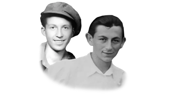 Kalman Braun (left) and Leopold ‘Lipa’ Lowy (right) as teenagers before their deportation to Auschwitz-Birkenau in 1944. Selected as twins for Josef Mengele’s medical experiments, both survived and later gave the testimony on which Kalman & Leopold: Surviving Mengele’s Auschwitz is based. Courtesy of the Braun and Lowy families