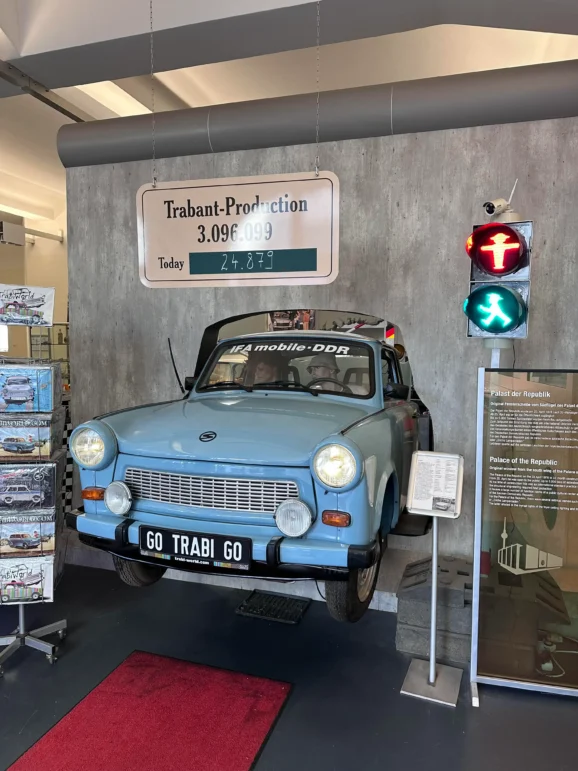 Trabi-World is one of Berlin’s most distinctive, good-humoured tourist experiences, part living museum, part driving school, part Cold-War time machine and it has become the unofficial headquarters of the city’s enduring affection for the Trabant. The experience, hosted by the quick whited Thomas blended hands-on driving, guided storytelling, and a surprisingly rich cultural backdrop, all delivered from a one-way radio built into the dashboard of our Trabi.