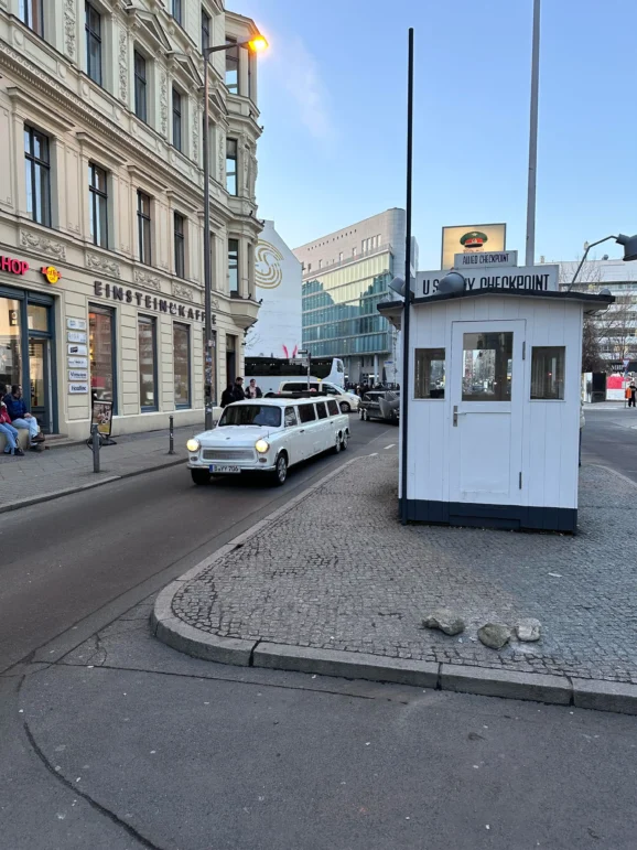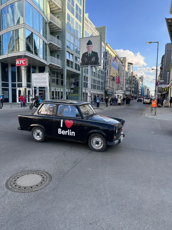 Crossing the Oberbaum Bridge, with its twin towers and sweeping arches, the Trabi felt almost heroic. The wind whistled through the cabin. The engine hummed. The whole car seemed to be enjoying the view as much as I was. Finally, we cruised past Checkpoint Charlie, where tourists photographed us as if we were part of the attraction!